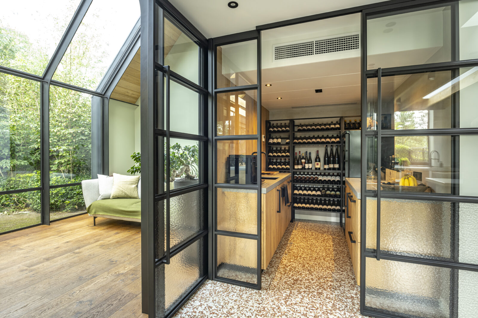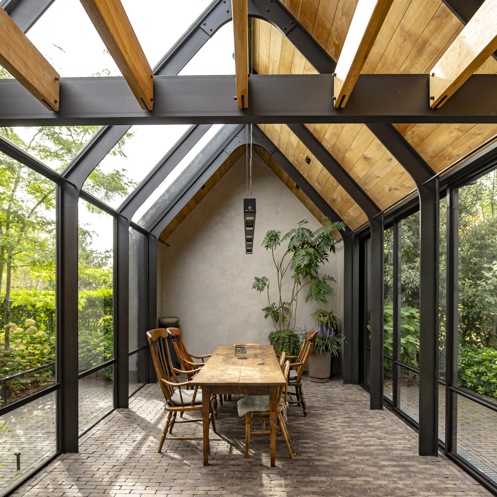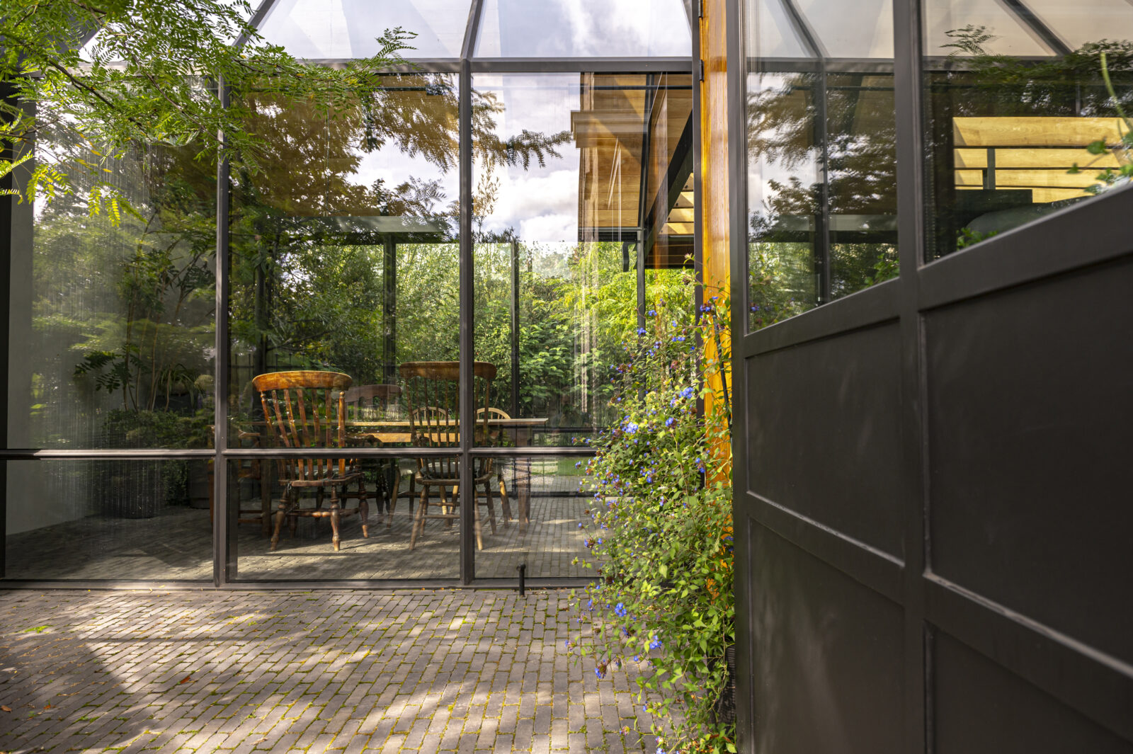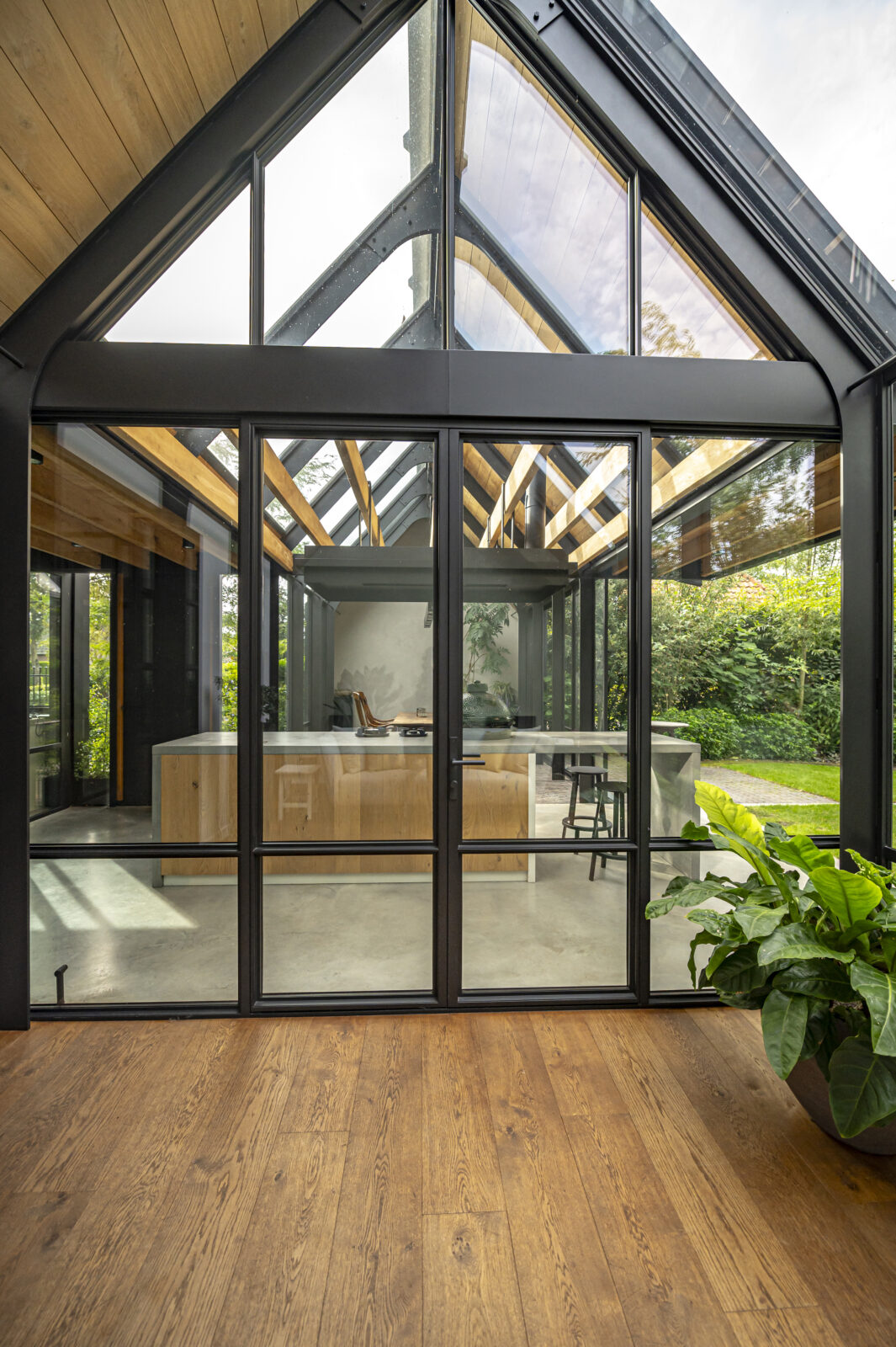 Wat deze aanbouw echt uitzonderlijk maakt, is de naadloze samensmelting van binnen en buiten. De glazen wanden vormen geen barrières, maar een vloeiende overgang tussen de binnen- en buitenwereld.