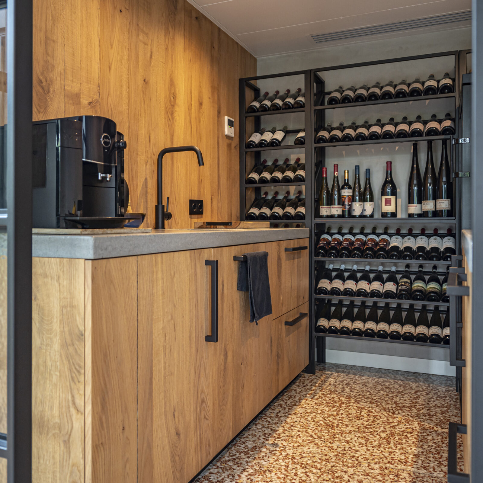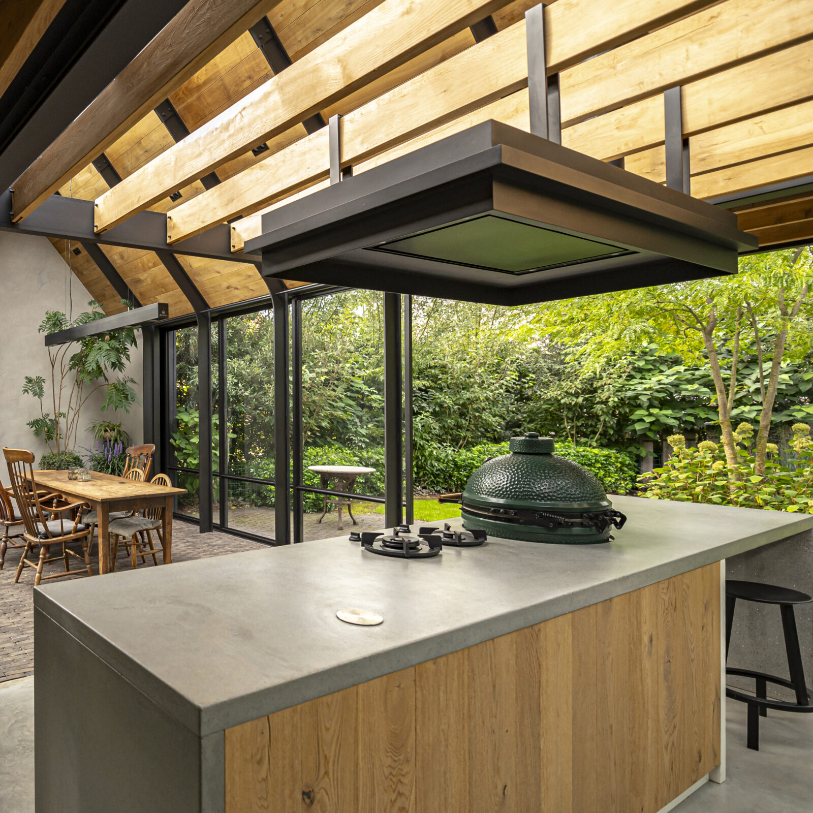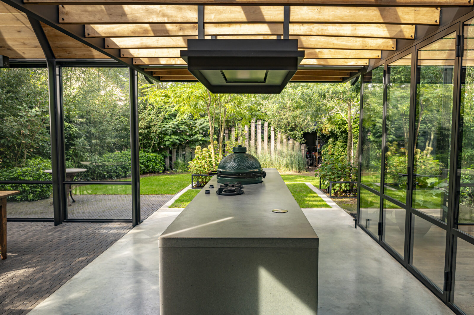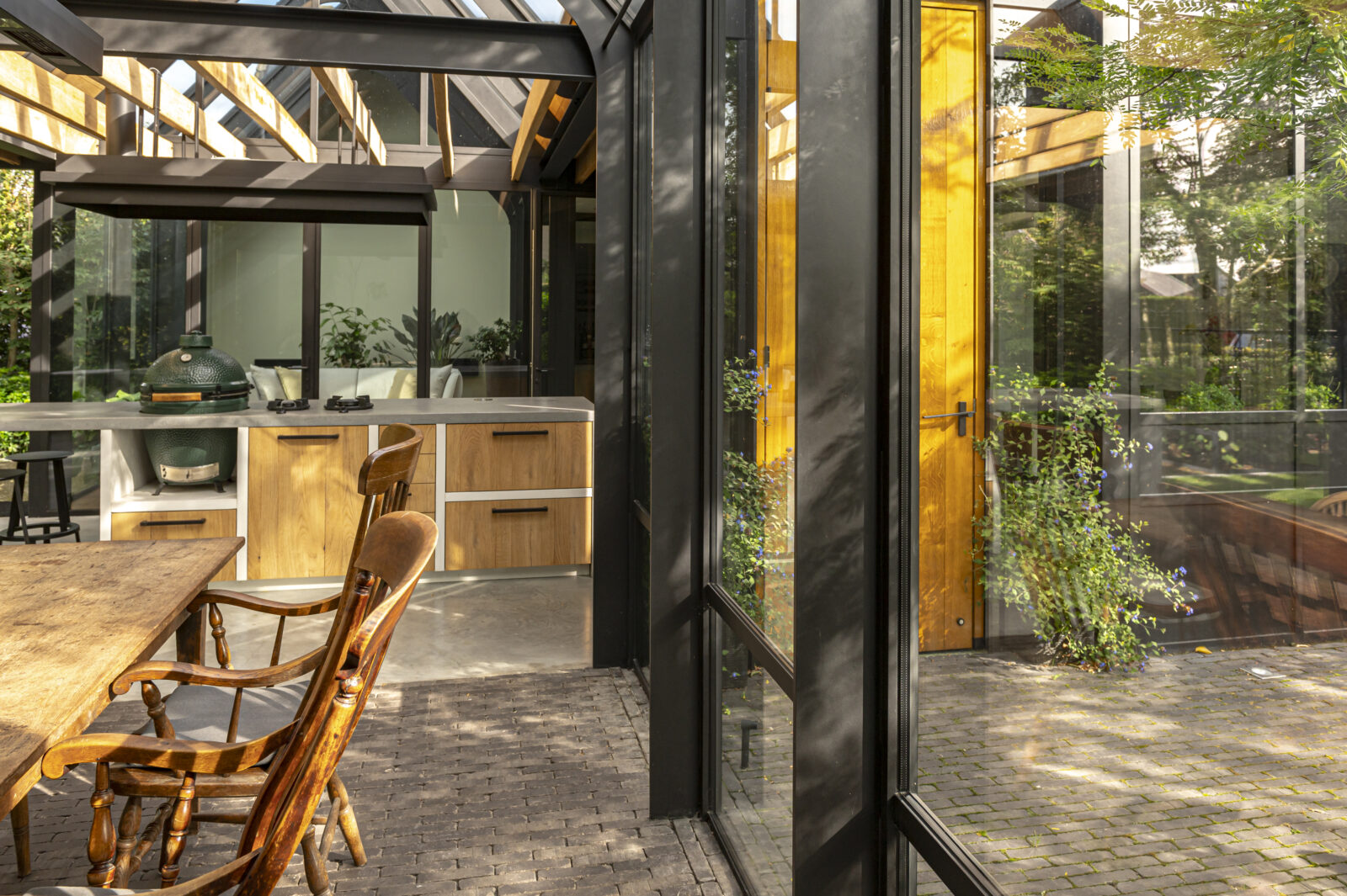 Wanneer je de glazen wanden opent, transformeert de woonkeuken in een weelderige buitenkeuken, waar het bereiden van maaltijden een buitengewone ervaring wordt. Het eetgedeelte wordt een riant terras, ideaal om te ontspannen en te genieten van de frisse buitenlucht.