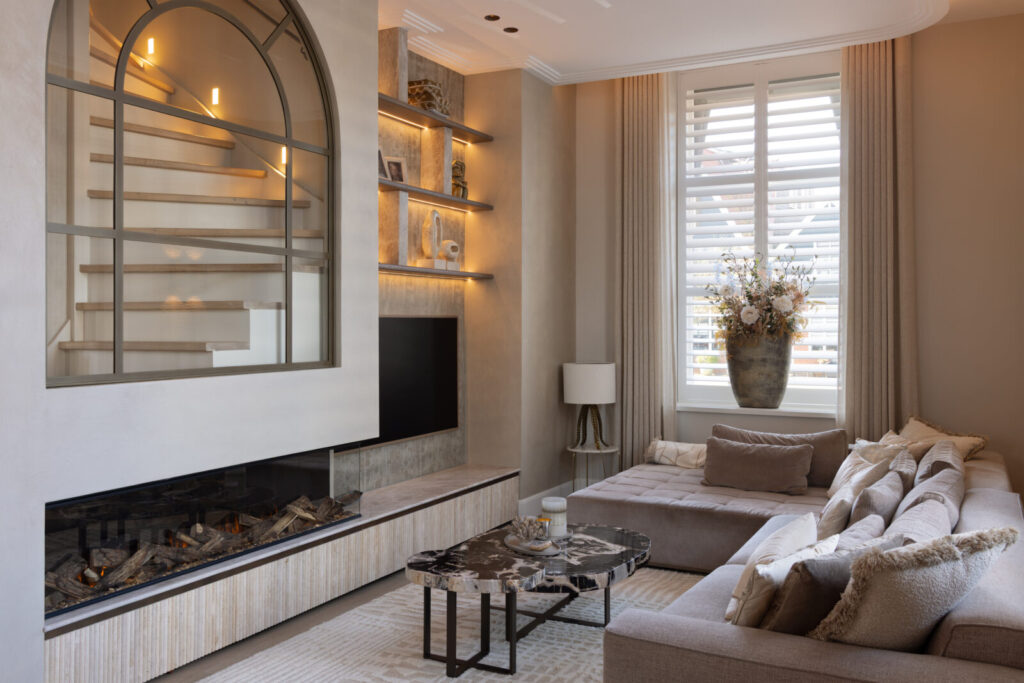 Het stalen frame volgt een zachte curve die contrasteert met de strakke lijnen in het interieur. Door de boog ontstaat een geraffineerd inkijkje tussen twee leefruimtes. Licht speelt langs het metaal, schaduw verdiept de vorm en elke stap op de trap verandert het perspectief.